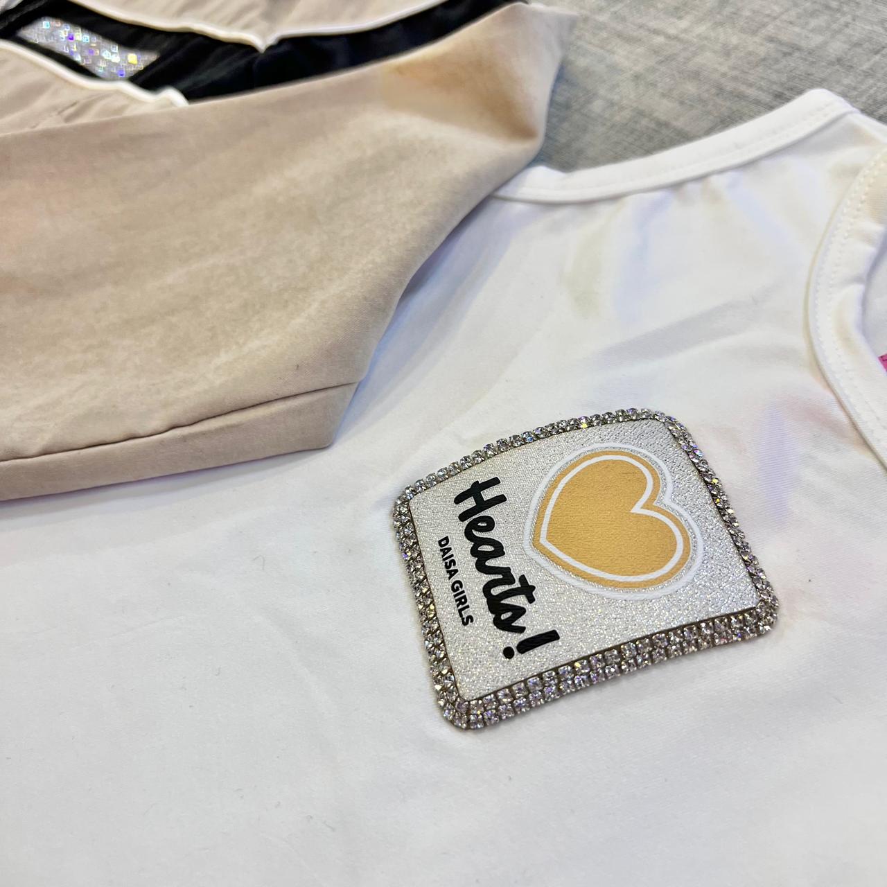 👕 Camisilla blanca sin mangas, con un estampado adorable de corazón y el mensaje "Hearts!" que transmite dulzura y estilo.