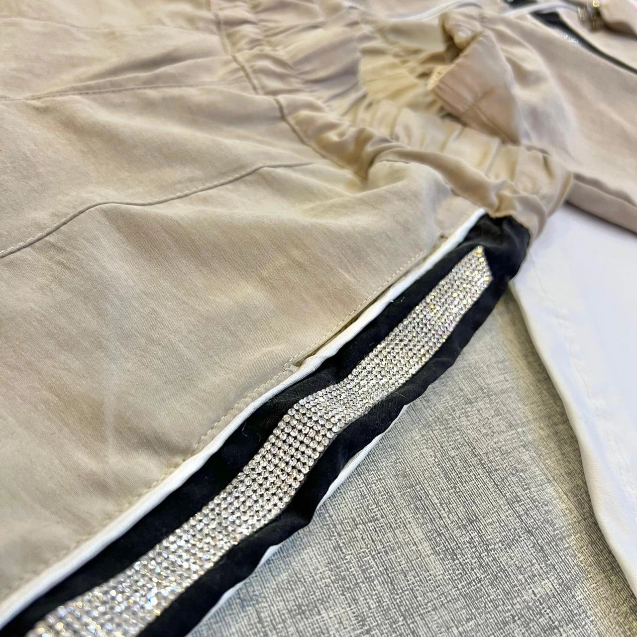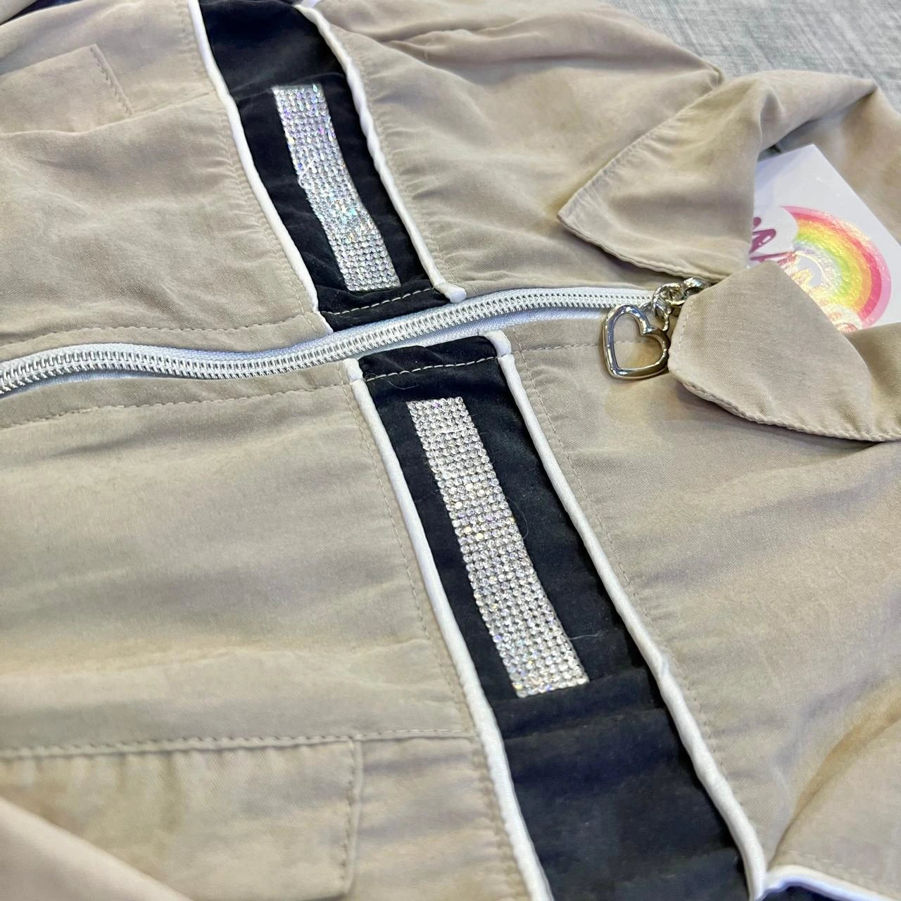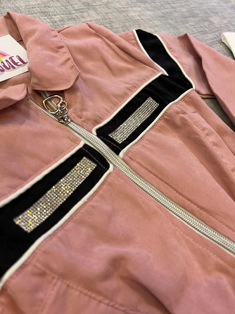 👚 Chaqueta tipo bomber en tono rosa, beige y caqui con cierre frontal, detalles en negro y apliques brillantes que aportan un toque glam que no pasa desapercibido.
